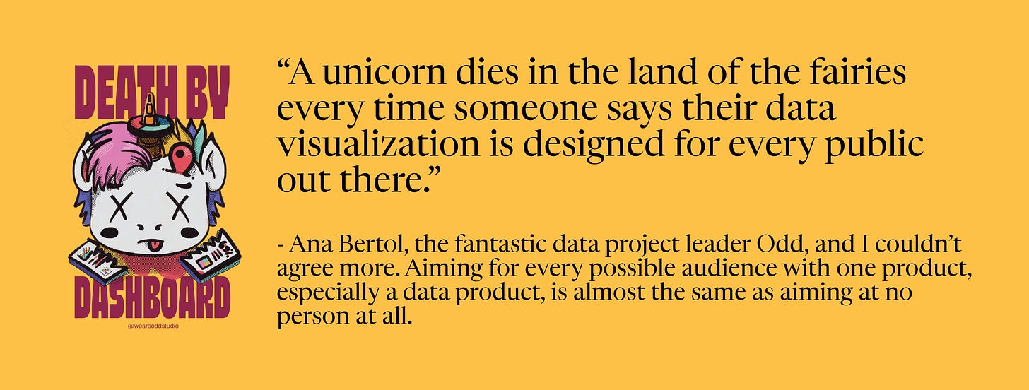 These may seem synonymous, but data products are much more holistic than data visualizations: they encompass every decision from the analytical solutions, to the format, to the media that will host it. Let’s break down each piece and see what happens when we forget our audience.